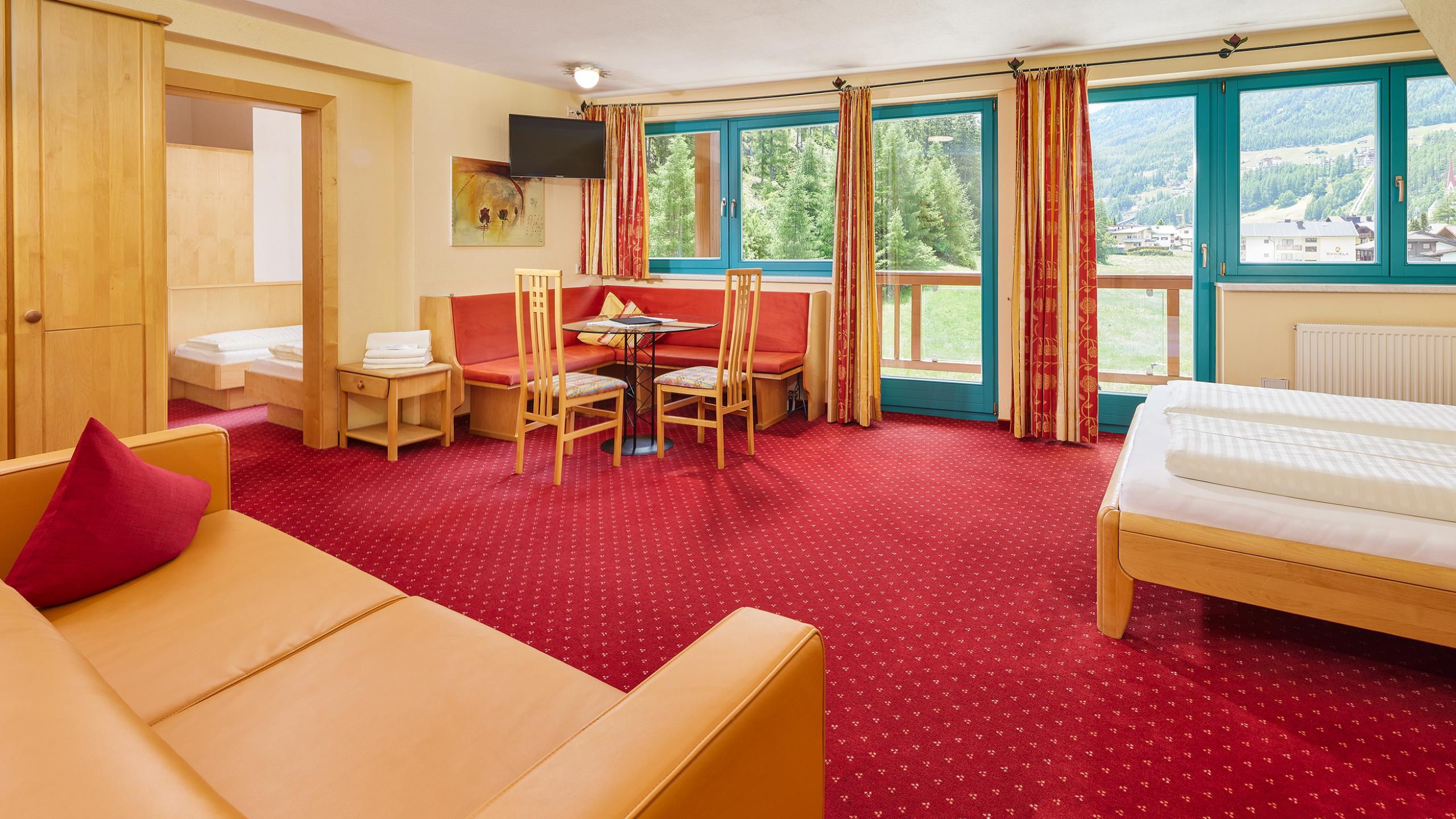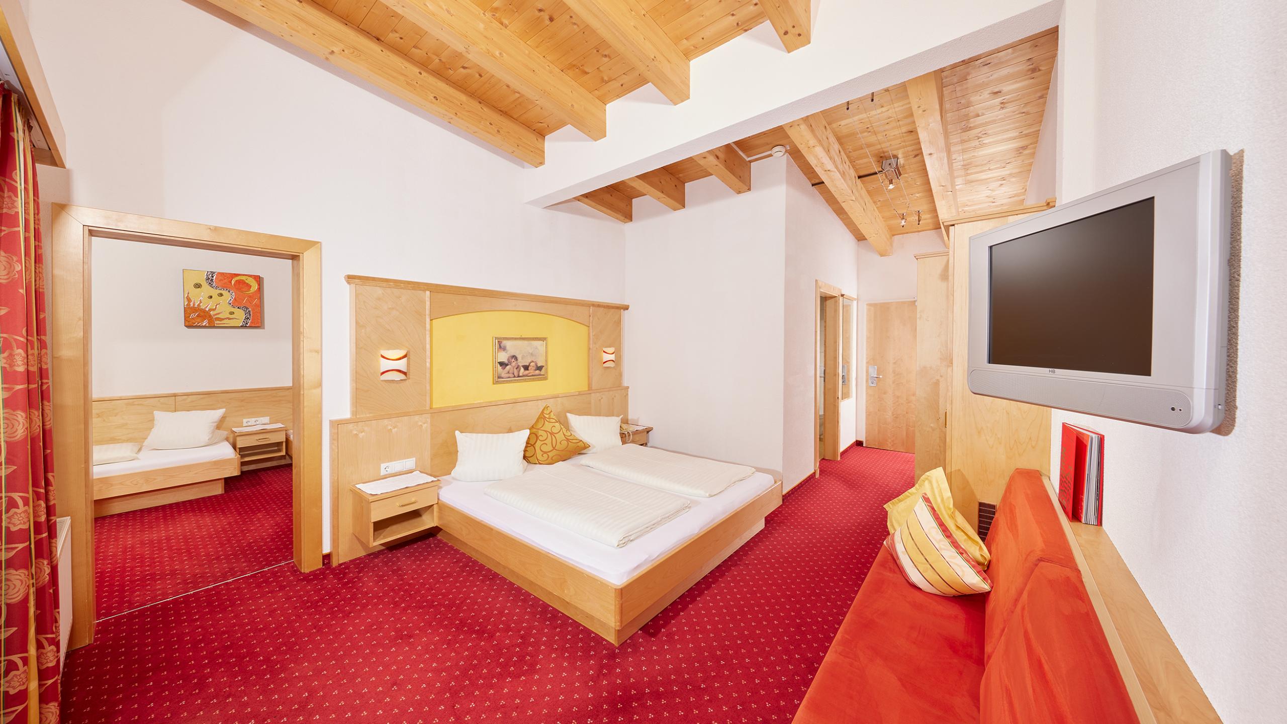 Geräumiges Familienzimmer mit zwei separaten Schlafzimmern, Vorraum, Balkon, Badezimmer mit Wanne oder Dusche, WC und Fön, Kabel-TV, Telefon, Minibar, Internet-Anschluss und Safe.